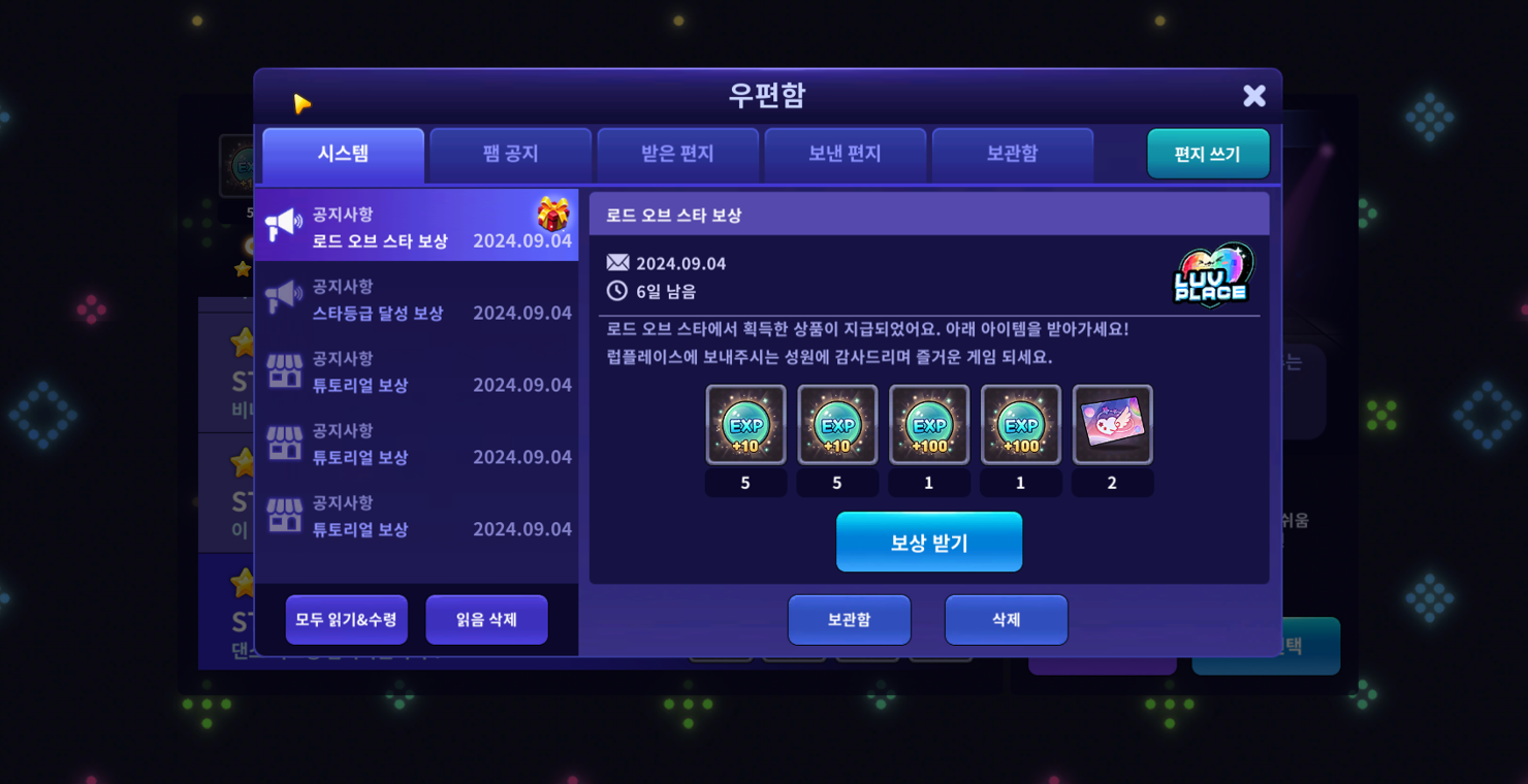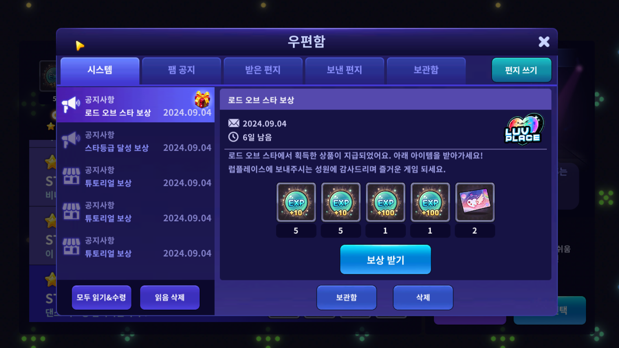 [우편함] ▶ [보상 받기] ▶ [아이템] ▶ [스타코인] 아이템을 모두 사용합니다.