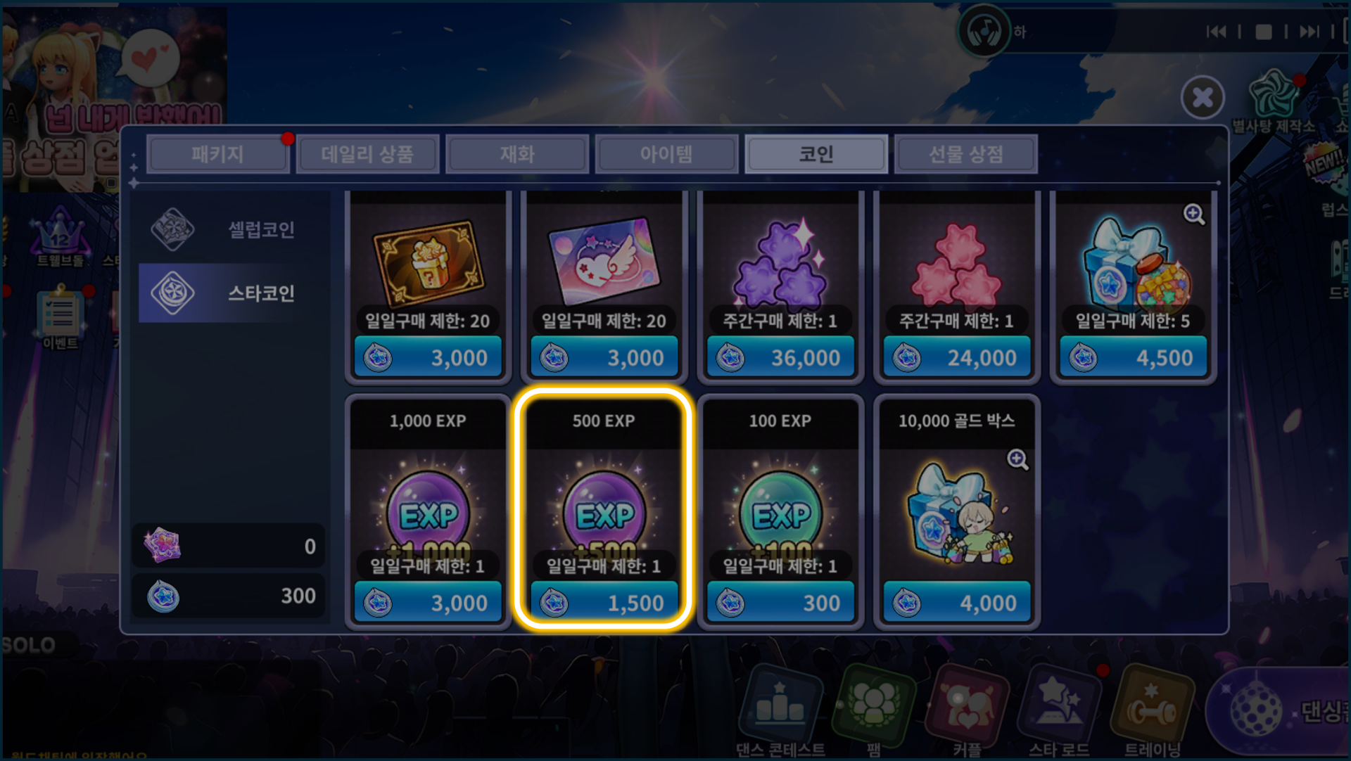 [상점] ▶ [코인] ▶ [스타코인] ▶ 보유 중인 스타코인으로 [1,000 EXP], [100 EXP] 아이템 구매