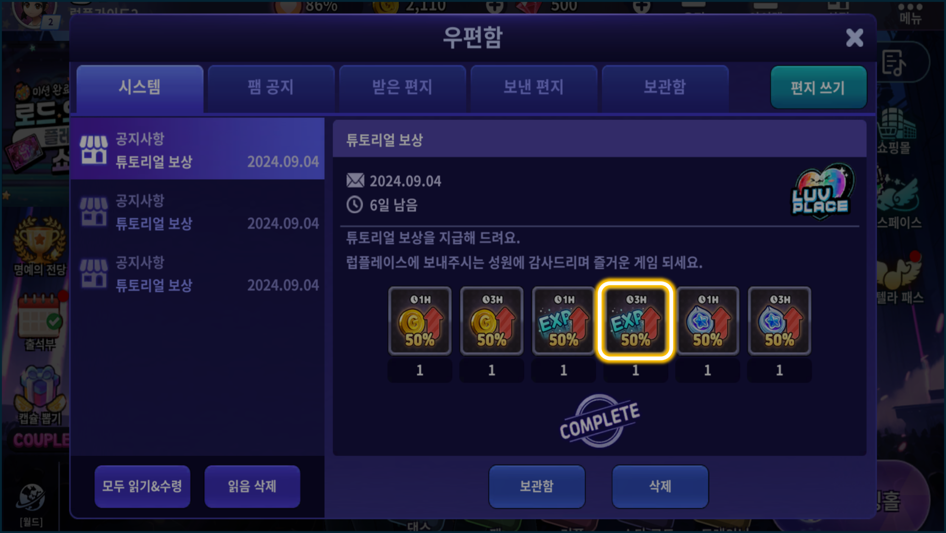 [우편함] ▶ [보상 받기] 클릭 ▶ [아이템] ▶ [EXP 50% 버프(3시간)] 아이템을 사용하세요.