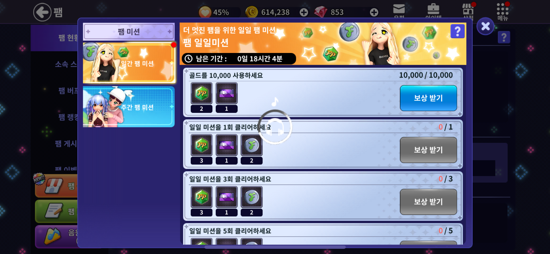 팸미션 보상 안받아져요 누르면 로딩