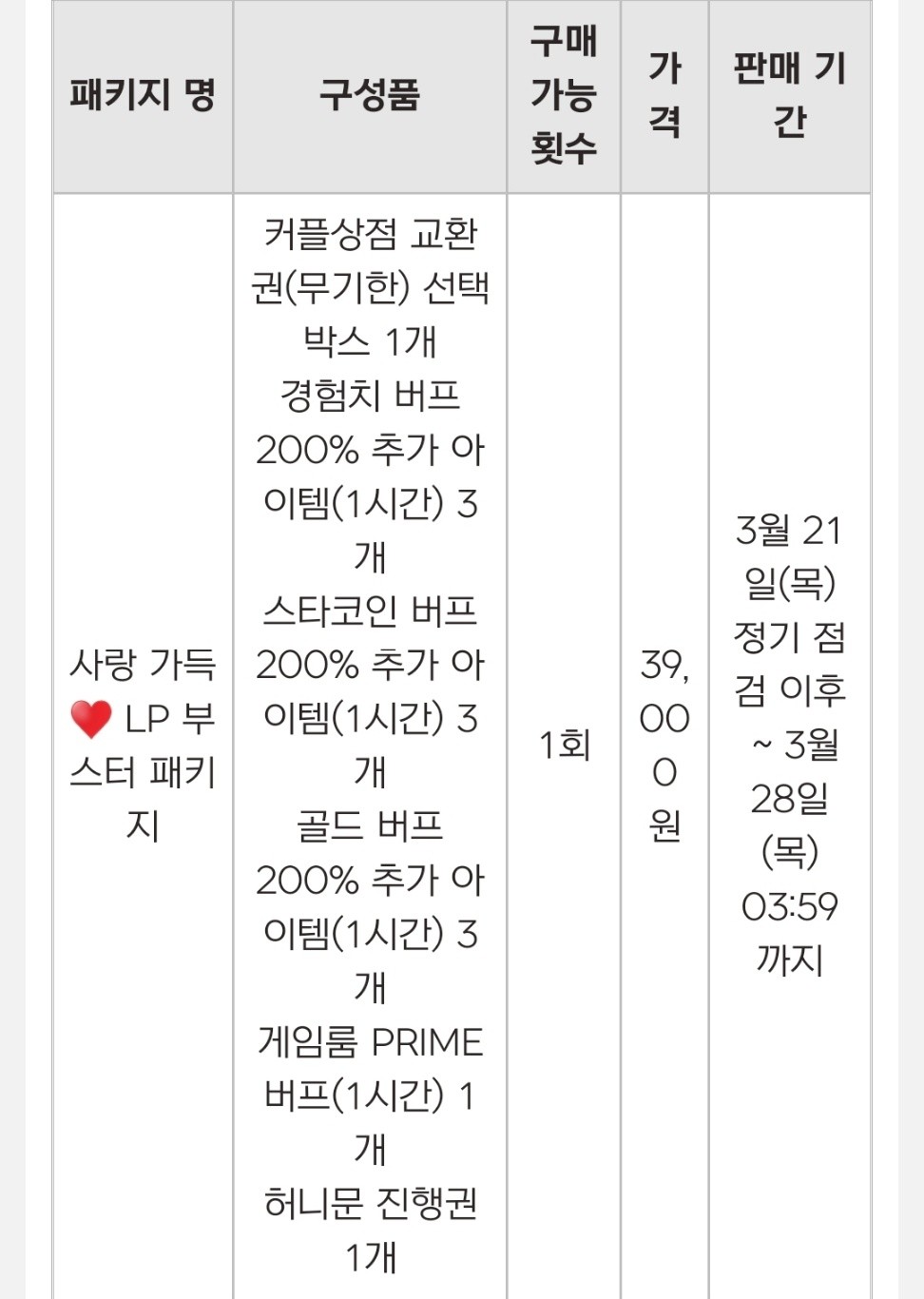 안녕하세요!! 커플 두명 모두 구매 시 'LP 버프 300% 추가 아이템(1시간)'을 추가 보상으로 받으실 수 있습니다!! 구성품 내용 재확인 부탁드립니다!! 감사합니다!!