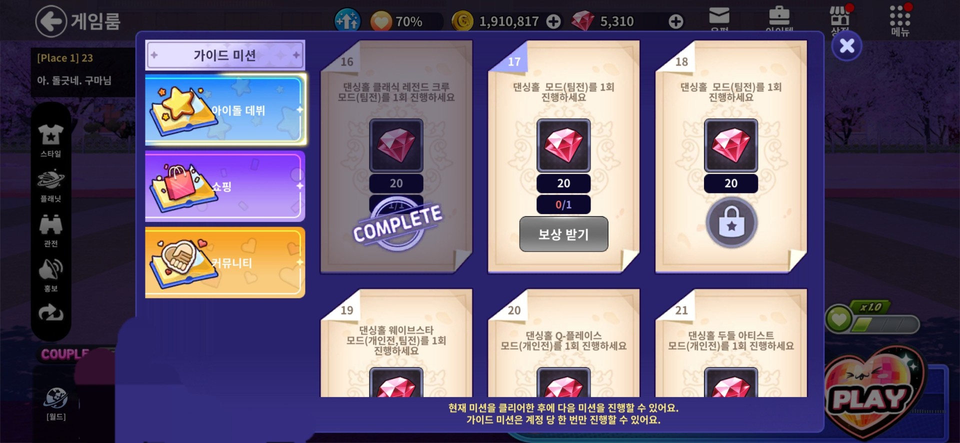 이거 왜안되는지 아시는분??팀전 커플댄스 된다해서 두번 했는데 완료안되네요