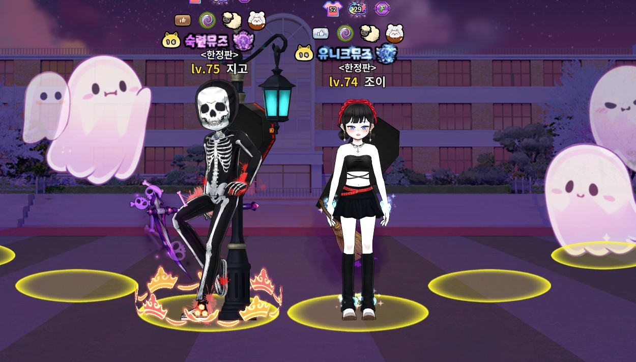 착용코스튬 : 아찔한 할로윈! 스켈레톤 셋업, 아찔한 할로윈! 스켈레톤 두건, 으스스한 인형사 스타일리시 백, 아찔한 할로윈! 스켈레톤 슬립온, 아찔한 할로윈! 죽음의 낫