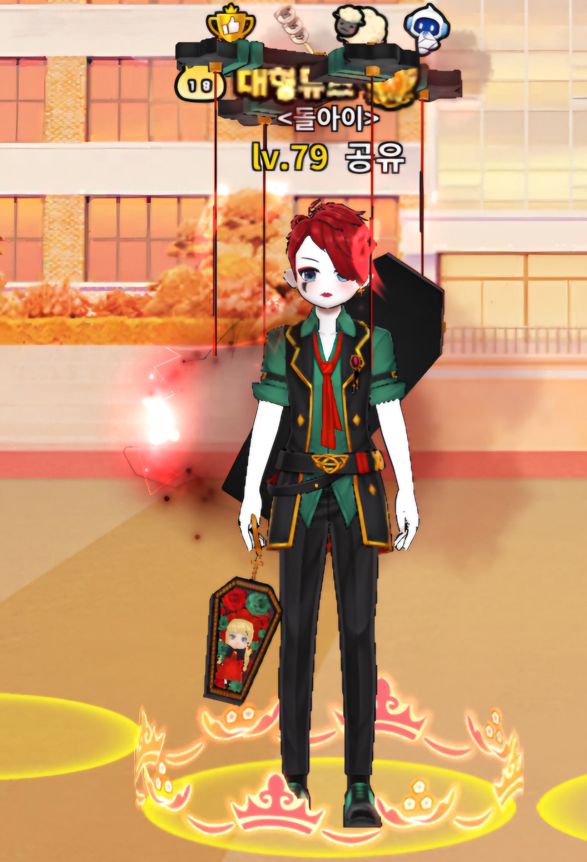 착용 코스튬 : 으스스한 인형사 헤어, 으스스한인형사 베스트 셔츠, 으스스한 인형사 팬츠, 으스스한 인형사 구두, 으스스한 인형사 스모키 페이스, 으스스한 인형사의 장밋빛 인형, 으스스한 인형사 스타일 리시백, 으스스한 인형사의 날 조종해봐, 으스스한 인형사 눈 페인팅, 으스스한 인형사 보석 브로치, 으스스한 인형사 큐빅 귀걸이