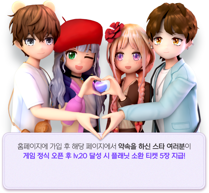 - 약속 이벤트를 완료한 계정으로 게임 정식 오픈 후 lv.20을 달성 시 플래닛 소환 티켓 5장이 지급됩니다.