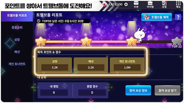 ■ 정해진 기간에 성장, 패션, 개인 토너먼트 점수를 얻으면 포인트를 쌓을 수 있어요.