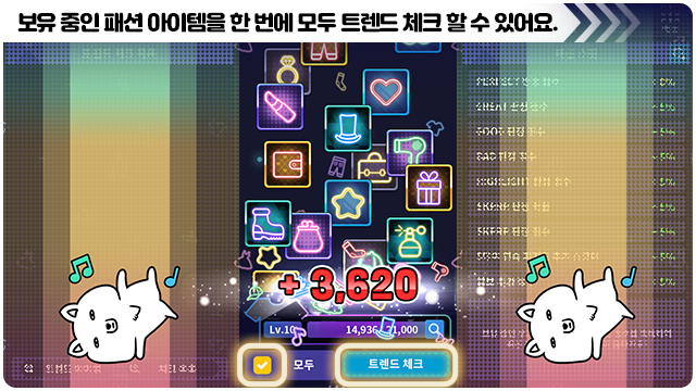 ■ 패션 레벨과 보유 패션 점수가 모두 MAX인 경우 트렌드 체크를 진행할 수 없어요.