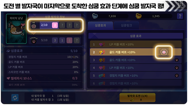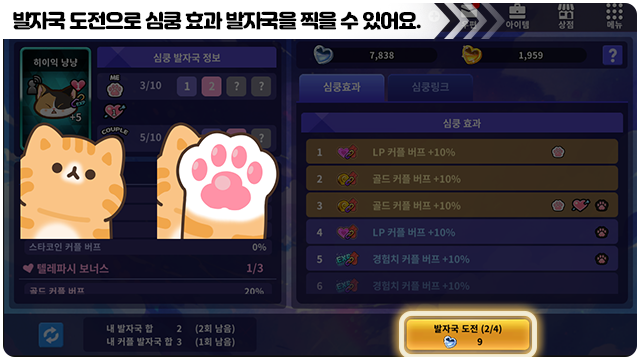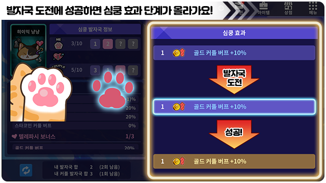 ■ 커플 심쿵 버프 화면에서 발자국 도전으로 심쿵 효과 단계를 올릴 수 있어요.