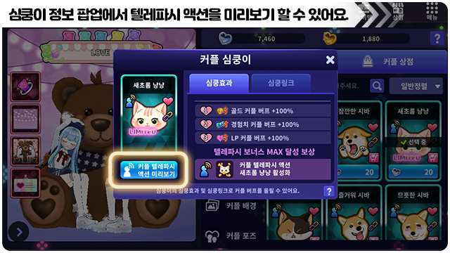 ■ 심쿵이 정보에서 커플 텔레파시 액션을 미리보기 할 수 있어요.