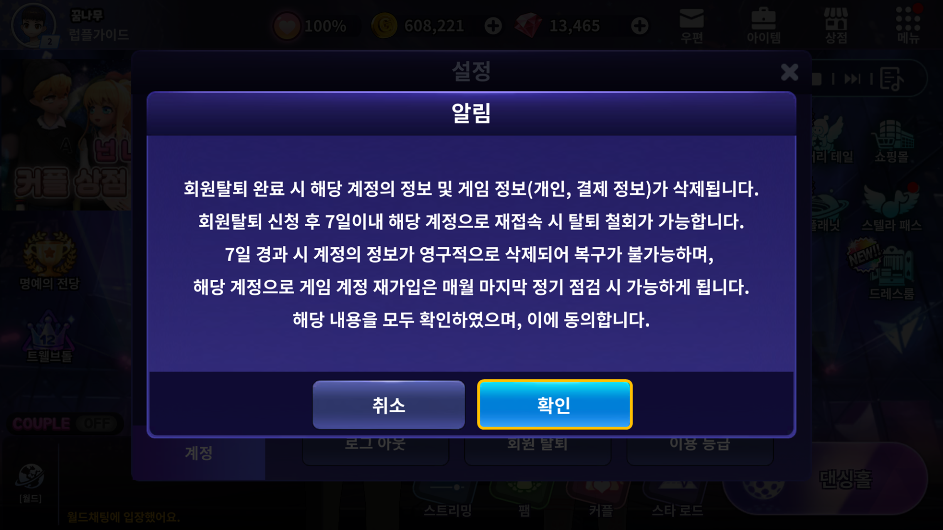 * 계정 탈퇴는 7일 경과 시 계정의 정보가 영구적으로 삭제되어 복구가 불가능하며,