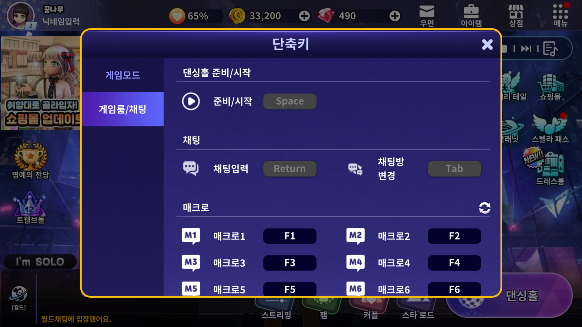 [메뉴] - [단축키] 클릭 시 게임 플레이 단축키 또는 채팅 매크로 단축키 설정이 가능합니다.