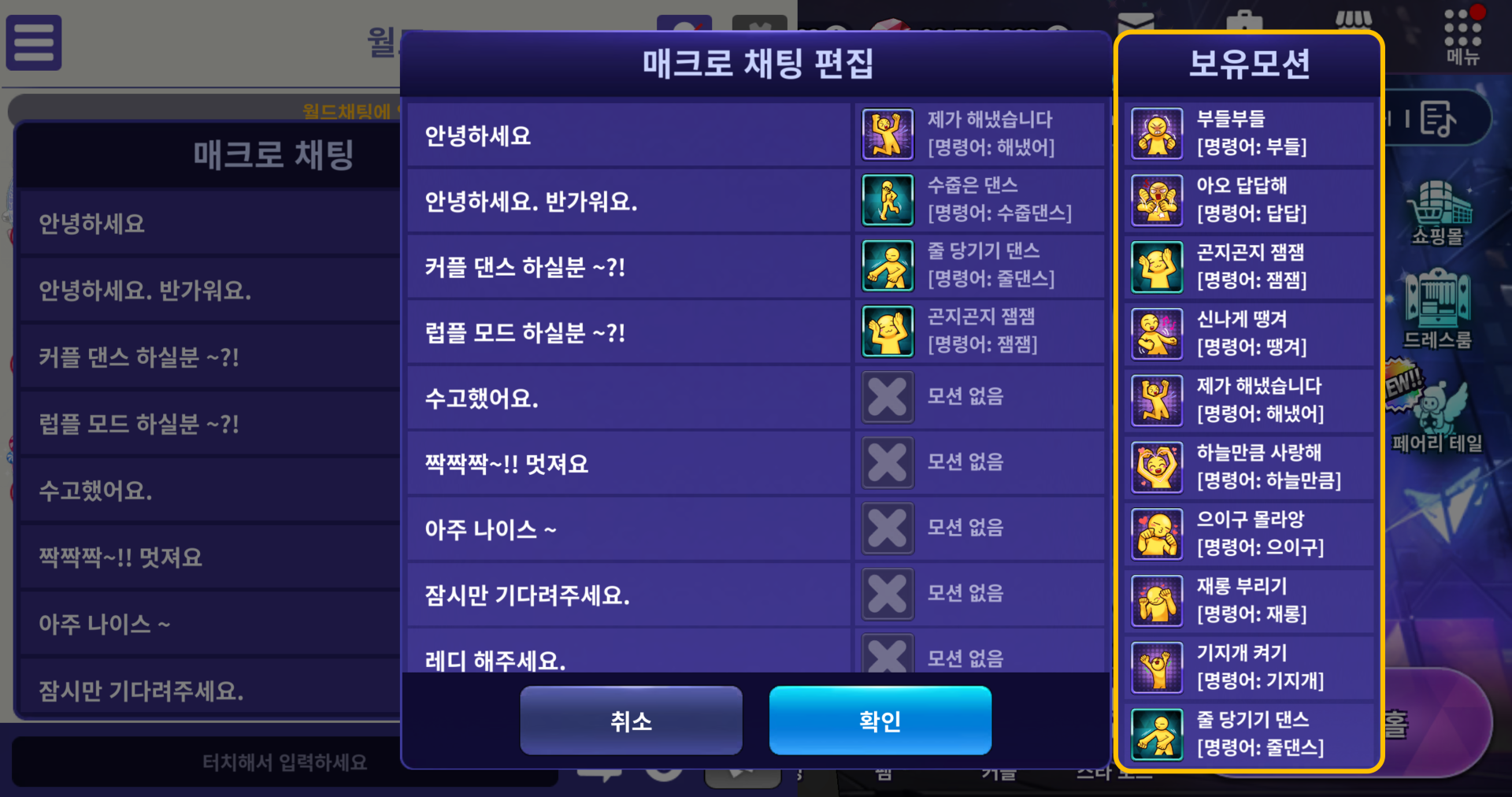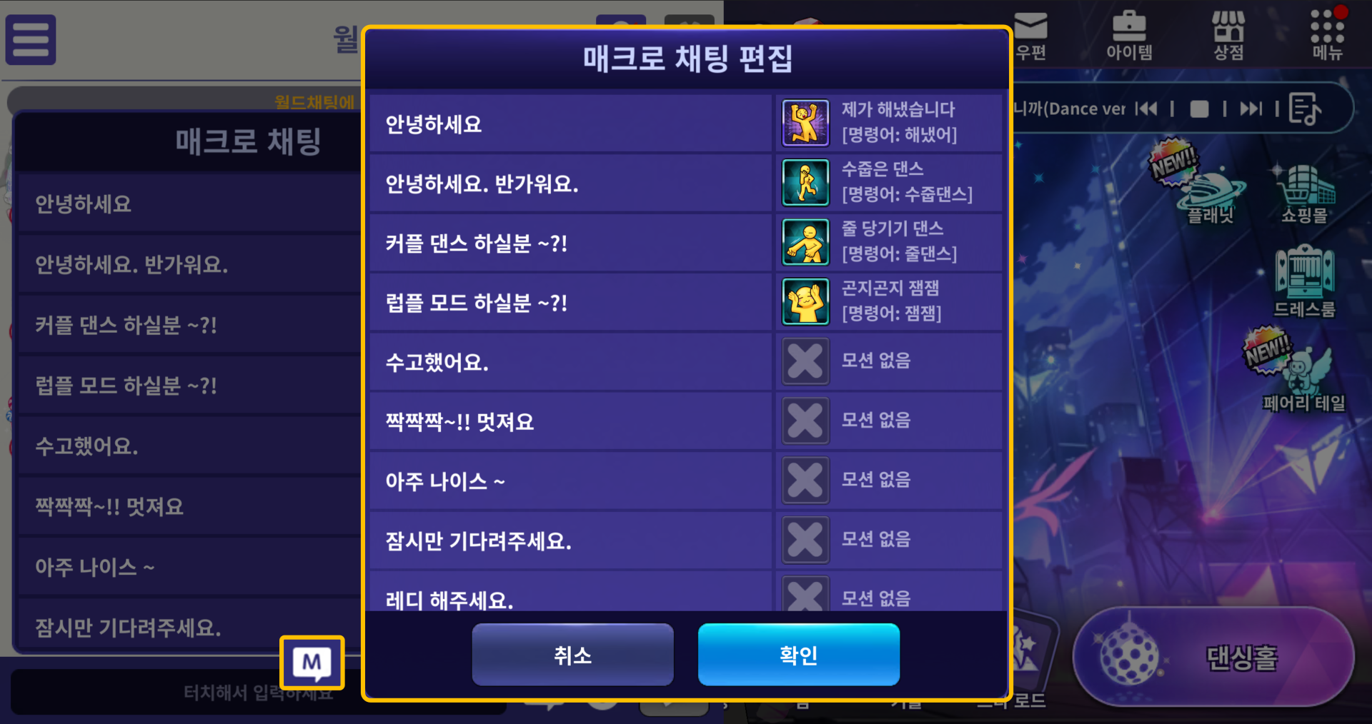 ■ 댄싱홀 게임룸에서 매크로 채팅 사용 시 설정한 모션이 함께 재생되며,