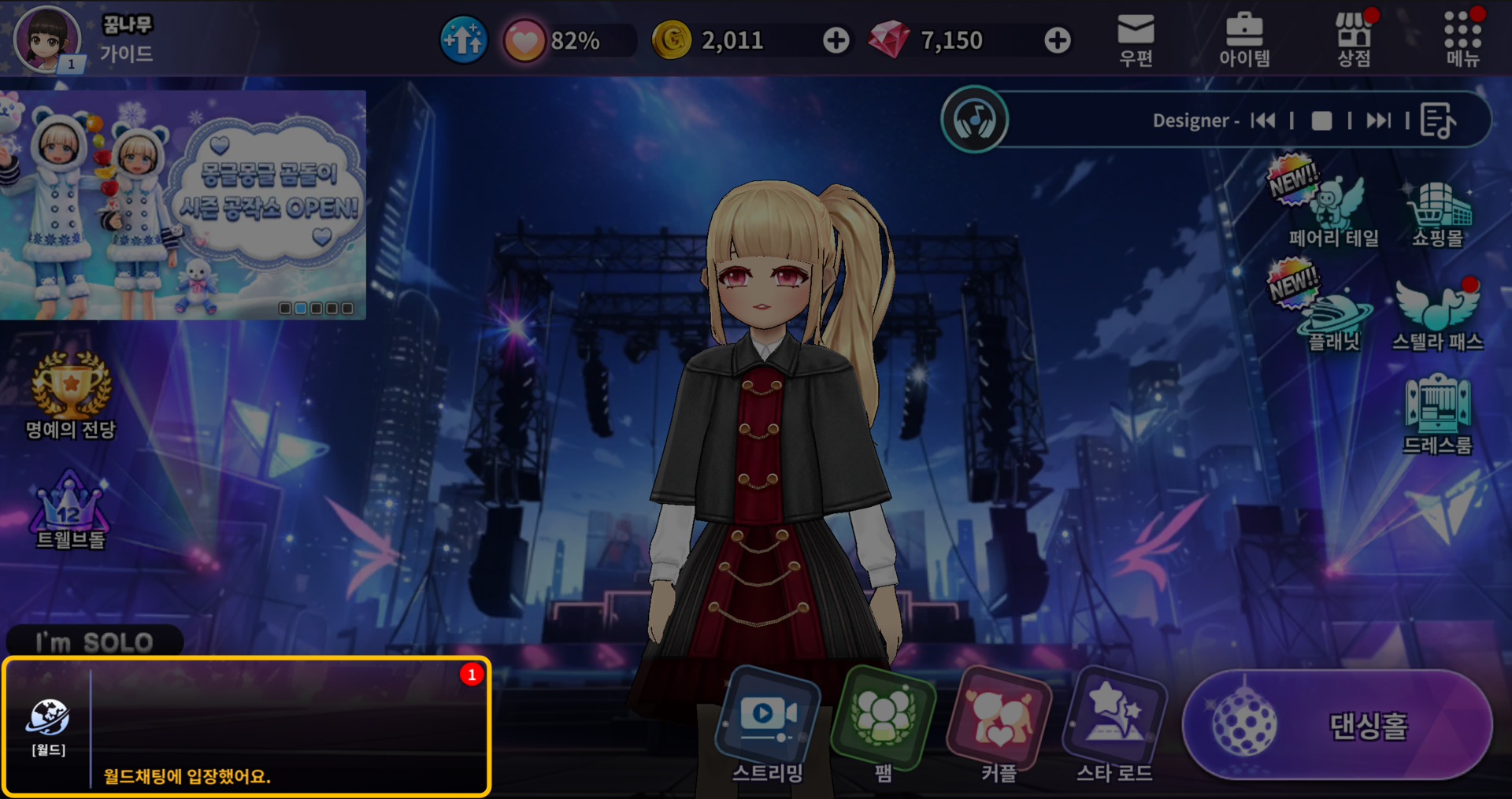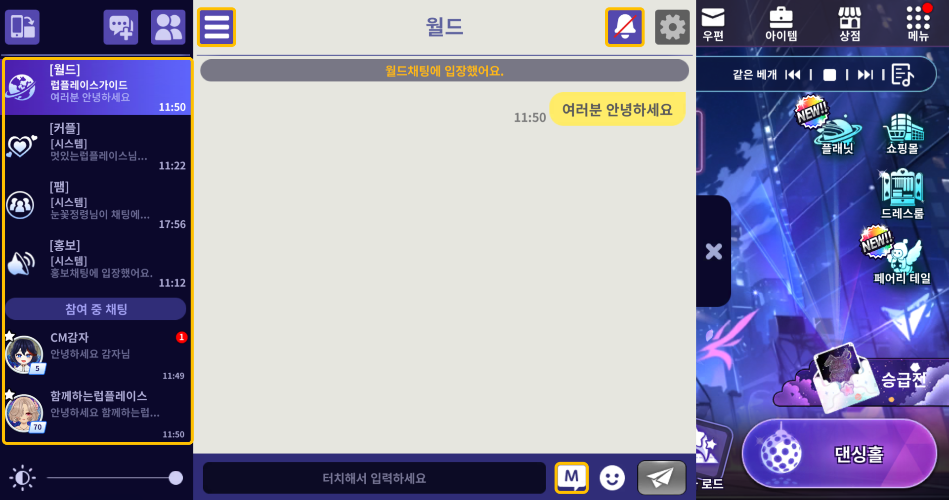 | 커플 | 커플이 입장할 수 있는 채팅 채널입니다. 커플이 없을 경우 비활성화되어 사용할 수 없습니다. |