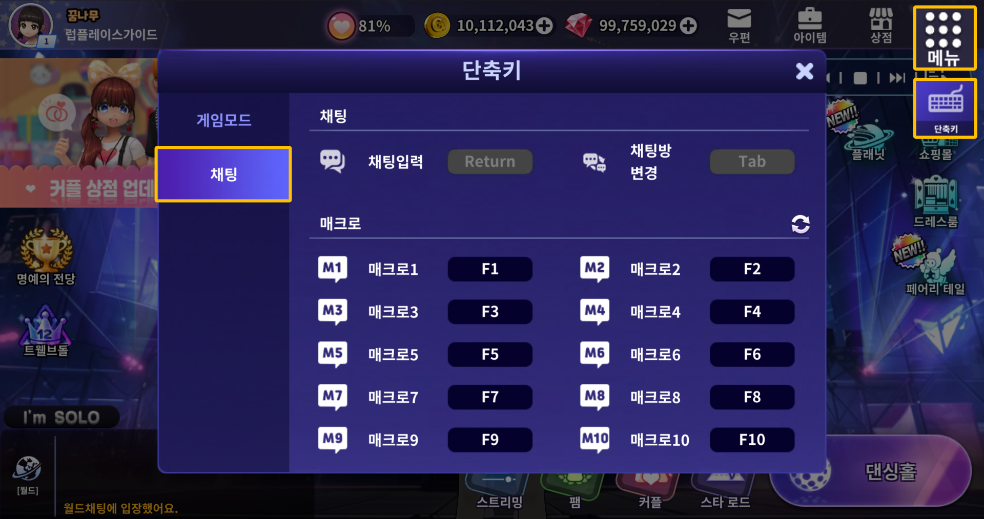 ■ 설정한 매크로 채팅은 댄싱홀 게임룸 및 게임 플레이 시 단축키를 통해 사용할 수 있습니다.