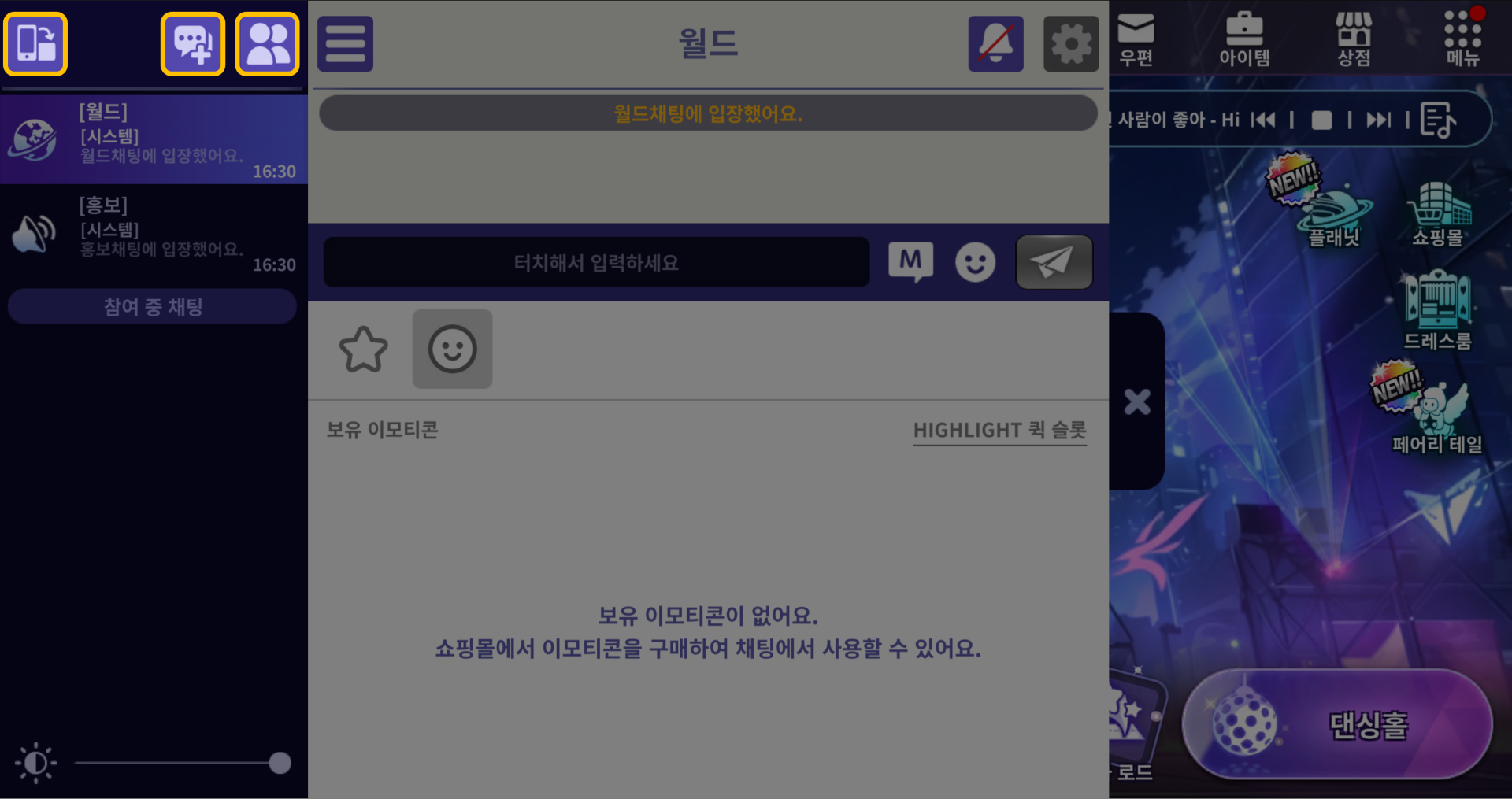■ 채팅은 다른 유저와 대화할 수 있는 [월드]가 기본적으로 노출되며,