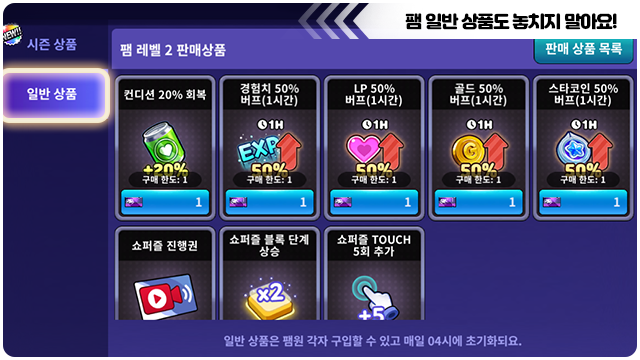 ■ 팸 일반 상점은 매일 04시에 초기화돼요.