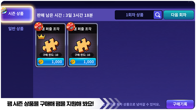 ■ 팸 시즌 상점은 회차별로 상품을 판매하며 현재 시즌 상품의 전 회차 상품을 확인할 수 있어요.
