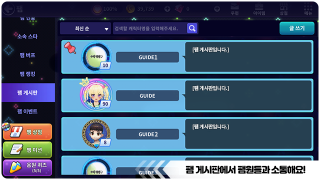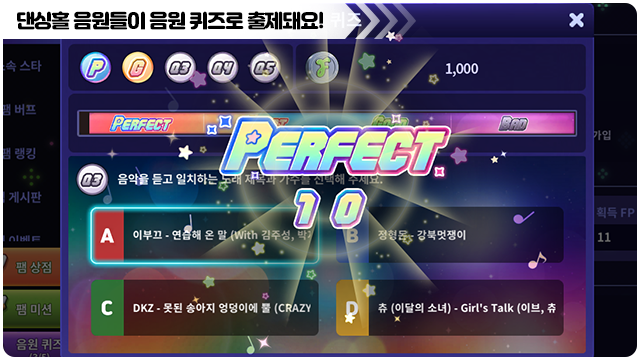 ■ 음원 퀴즈를 진행하면 팸 명예주화를 획득할 수 있어요.