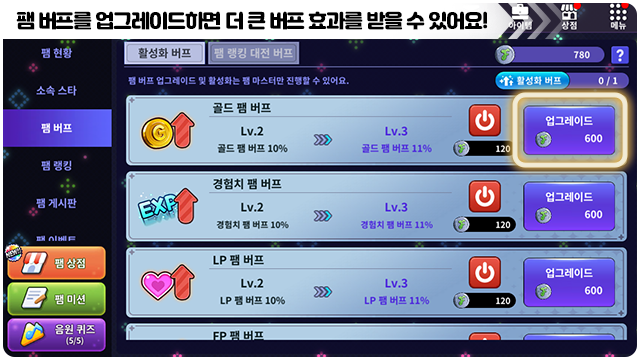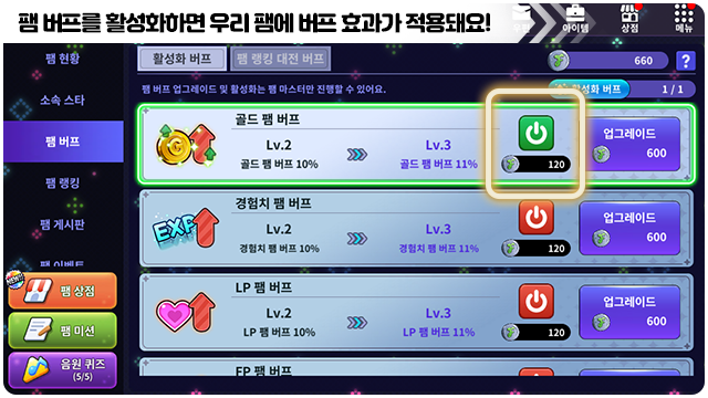 ■ 팸 명예주화로 버프 효과를 업그레이드할 수 있어요.