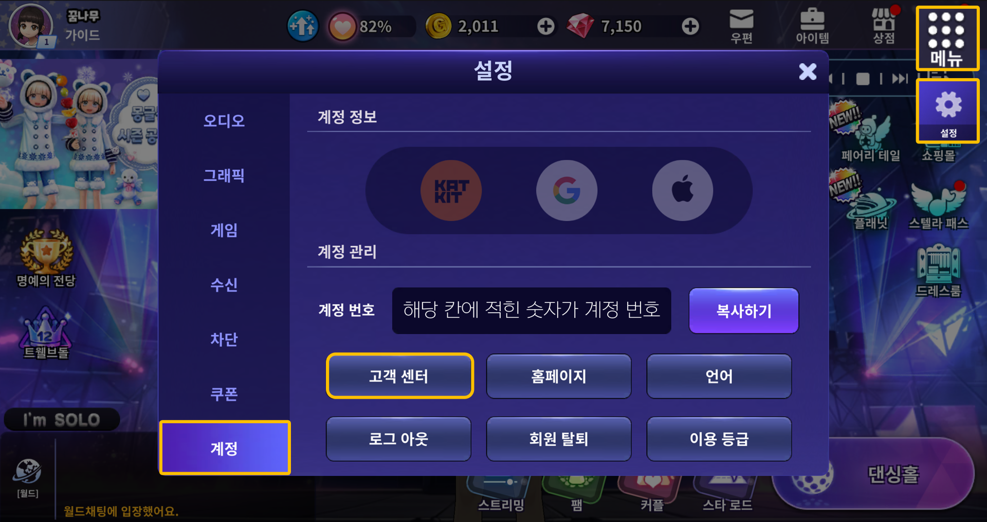 ■ [메뉴] - [설정] - [계정] - [고객 센터] 선택 시 고객 센터 이용이 가능합니다.