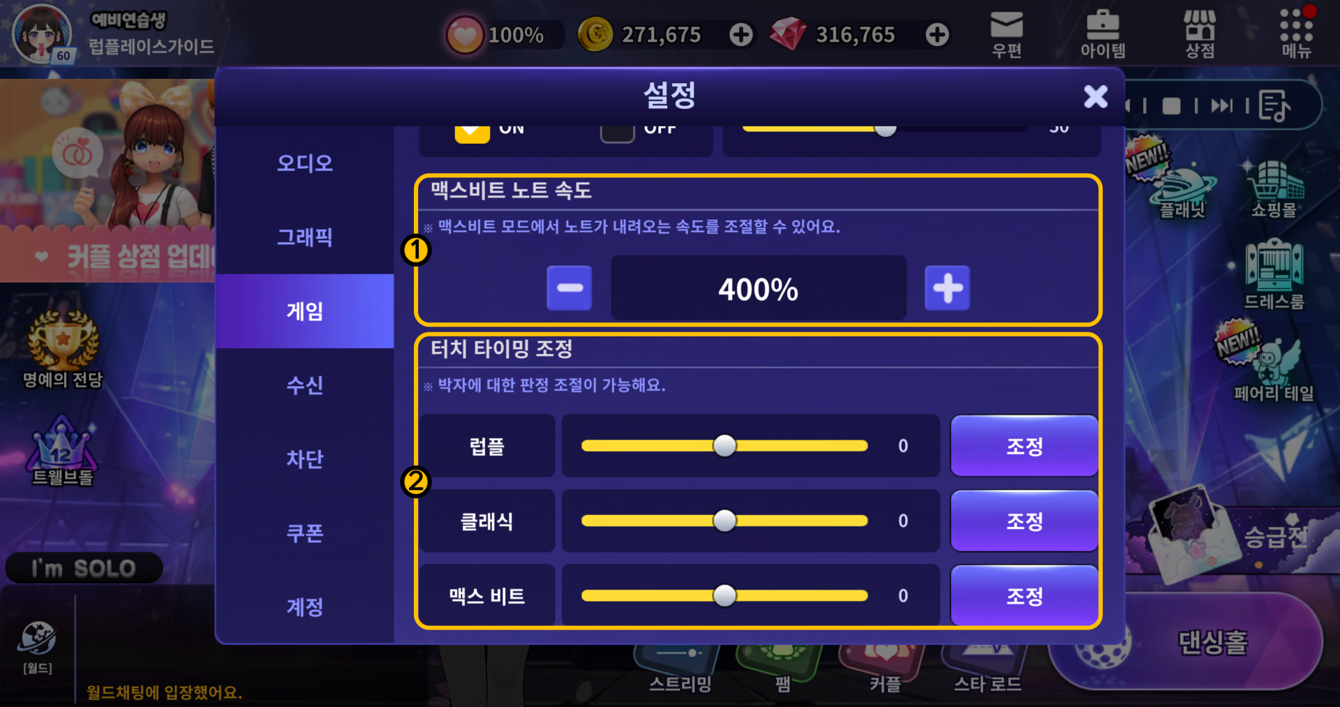게임 내 노트 속도 및 터치 타이밍 조정을 진행할 수 있습니다.