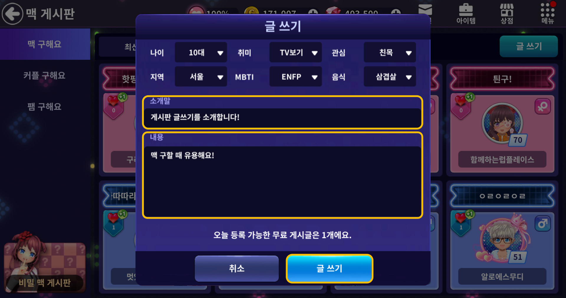 ⑤ 게시판 별 하루에 한 번 무료로 글을 작성할 수 있으며, [글쓰기 아이템]을 보유하고 있을 경우 추가 작성이 가능합니다.