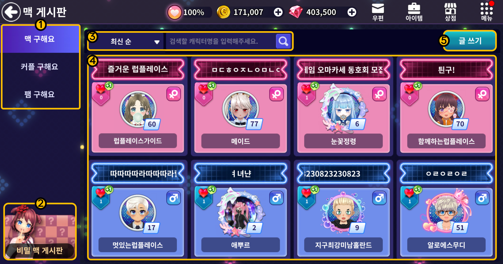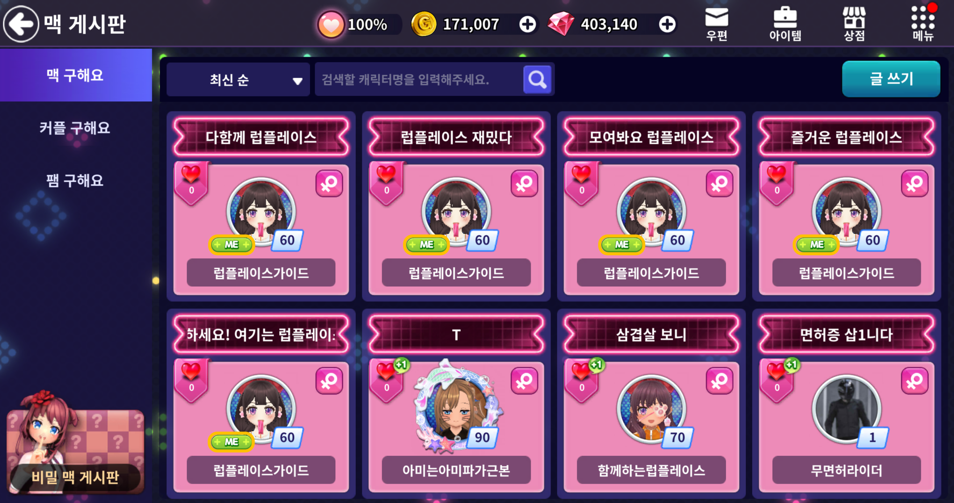 ■ 맥 게시판을 통해 맥 / 커플 / 팸을 구할 수 있습니다.
