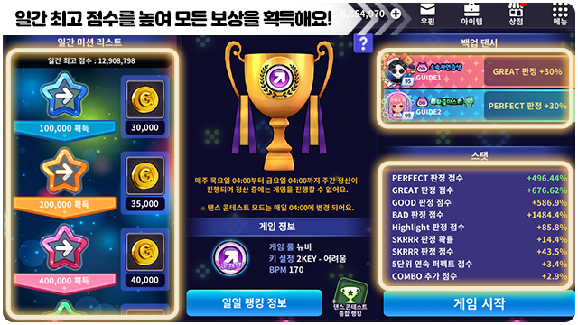 ■ 댄스 콘테스트 모드 4종(럽플, 클래식, 맥스비트, 웨이브스타)은 매일 오전 4시에 변경돼요.