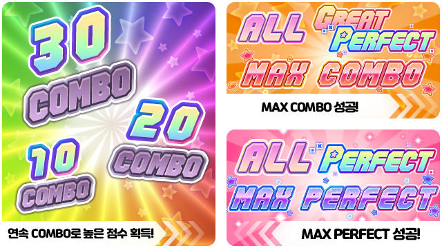 ■ 모든 노트를 GREAT와 PERFECT 판정으로 받으면 MAX COMBO를 성공할 수 있어요.