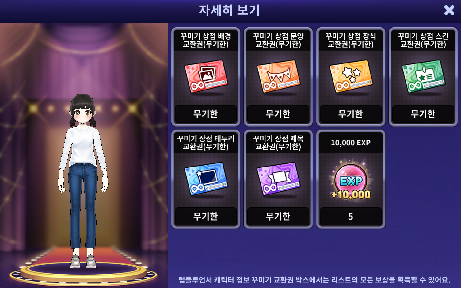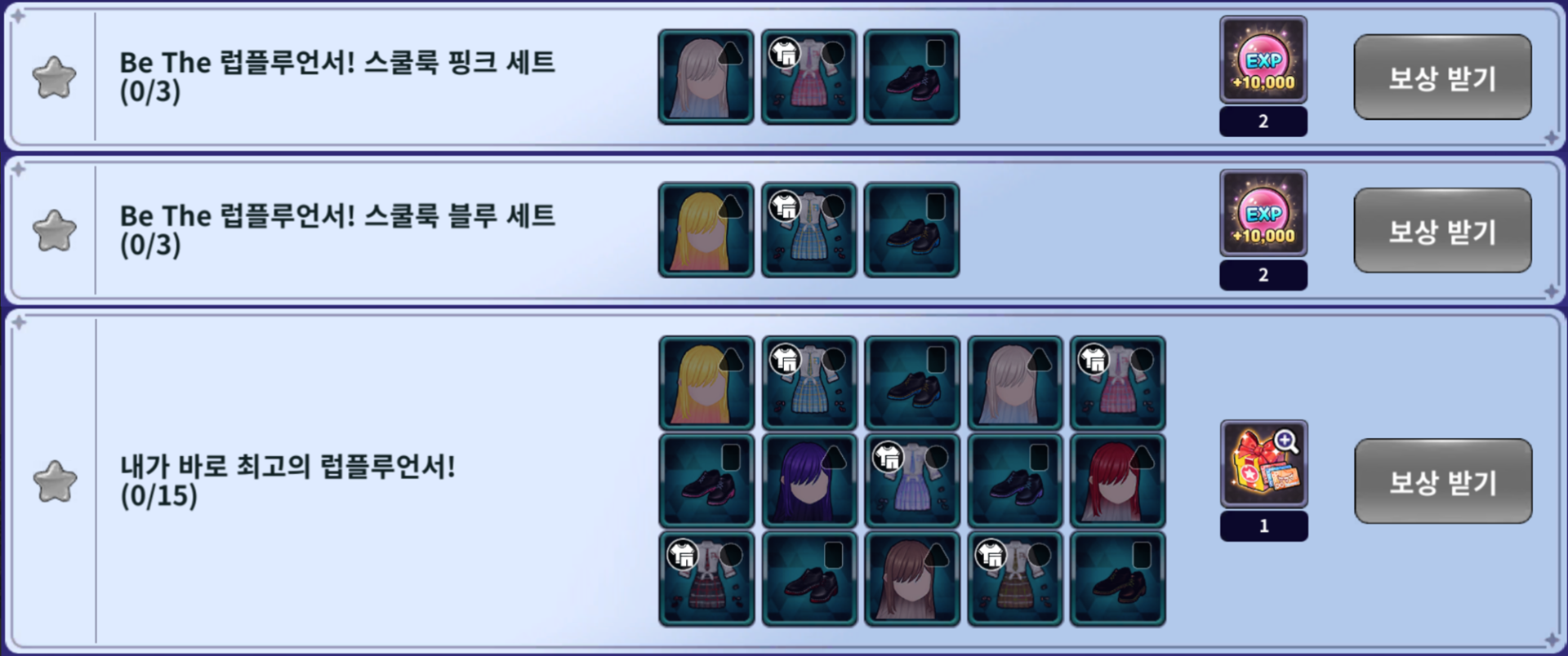 - Be The 럽플루언서! 스쿨룩 블루 세트 (보상: 10,000 EXP 2개)
