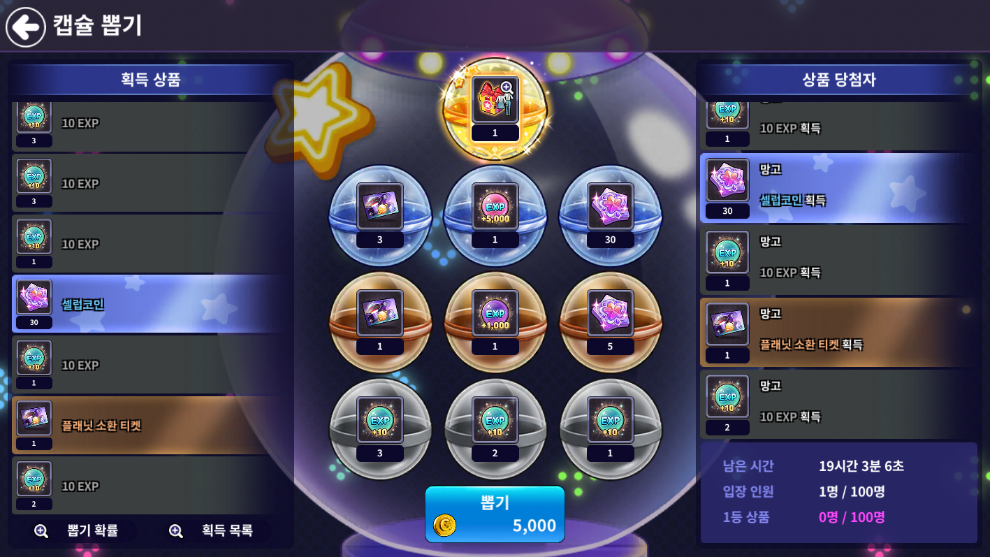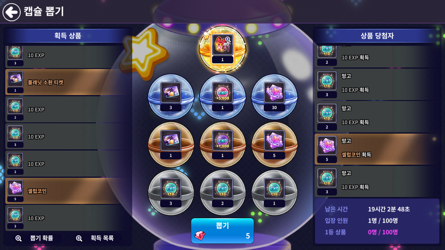 - 19시 부터 캡슐 각 캡슐 뽑기 방 입장이 가능하며, 입장 후 1회 뽑기 금액을 지불하여 캡슐을 뽑을 수 있습니다.