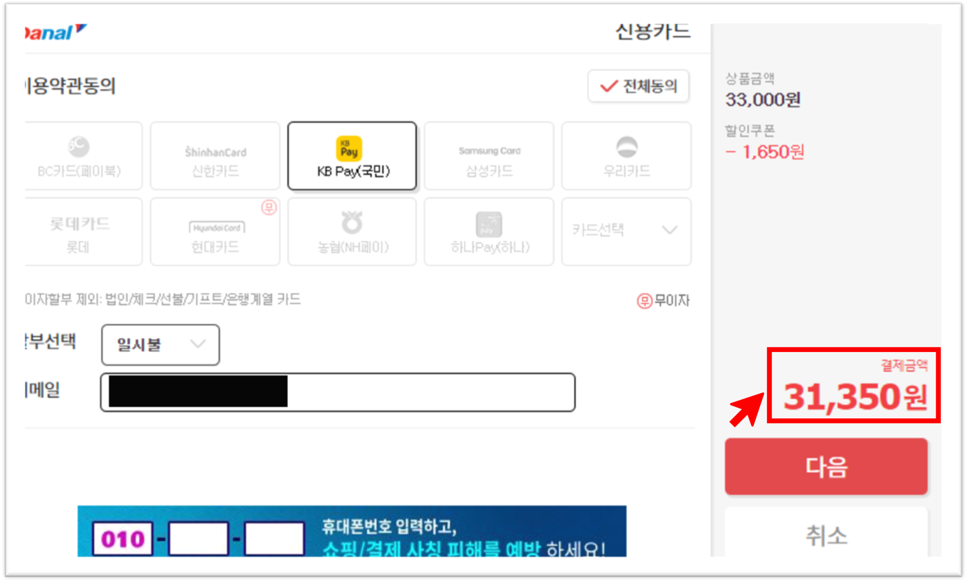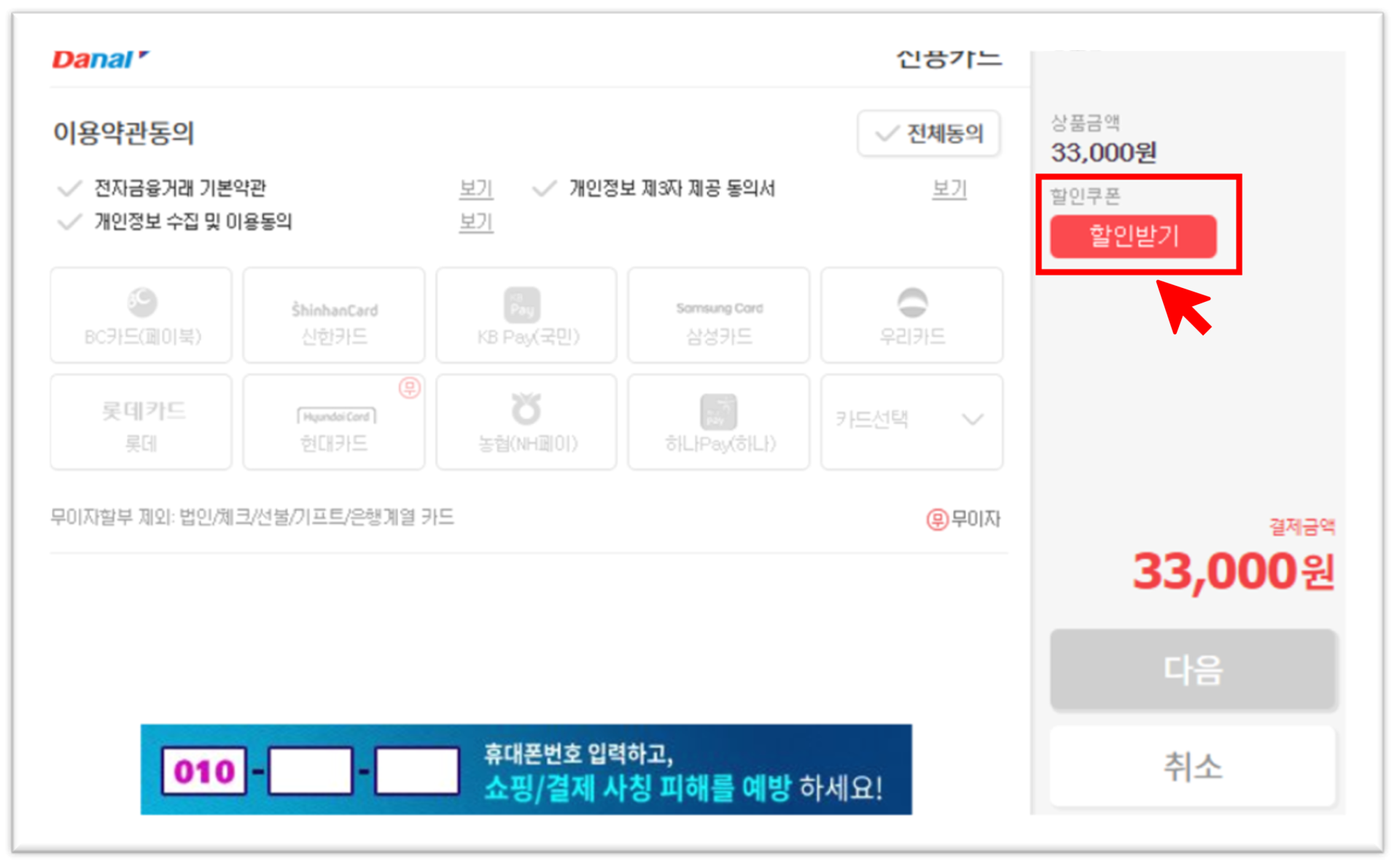 1. 결제 창에서 '할인받기' 버튼 클릭 - 할인받기를 클릭 후 할인이 적용됩니다!!!