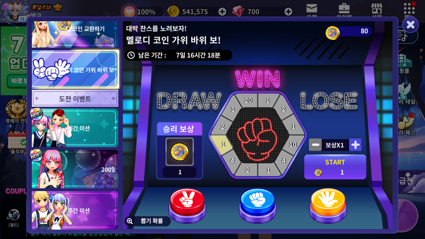 멜로디 코인 가위 바위 보! 이벤트가위 바위 보 게임에서 승리하여 룰렛에 당첨된 배수만큼