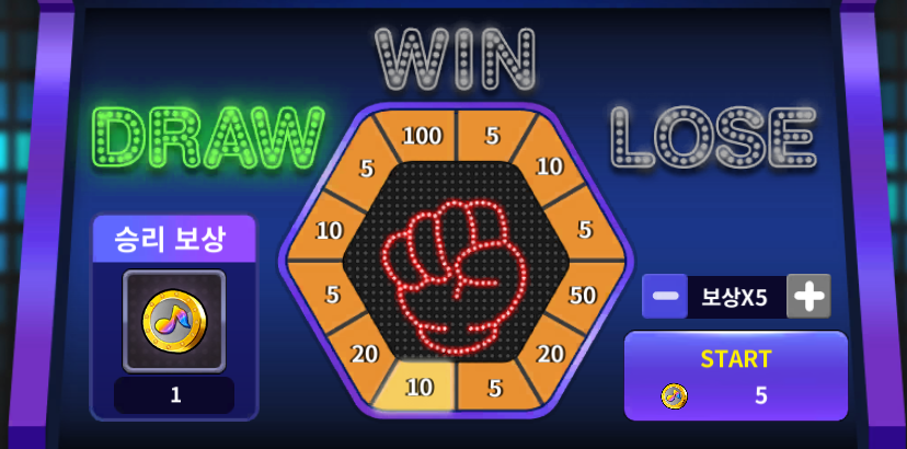 승리 보상의 경우 가위바위보 승리 후 룰렛이 멈춘 곳의 숫자 배수만큼 지급 받을 수 있습니다.