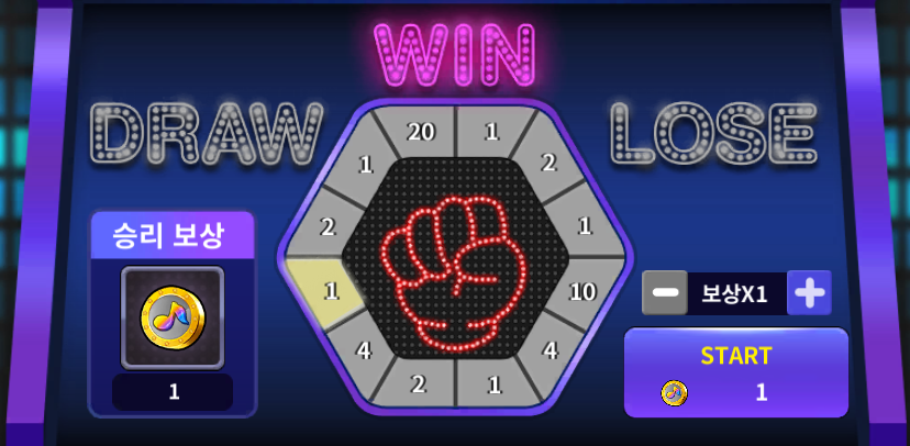 ex) 승리 보상이 멜로디 코인 1개이며, 가위바위보 승리 후 룰렛에 멈춘 숫자가 20일 경우