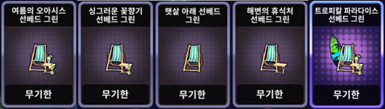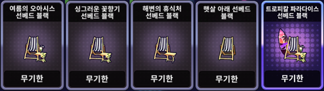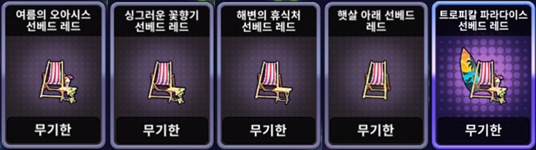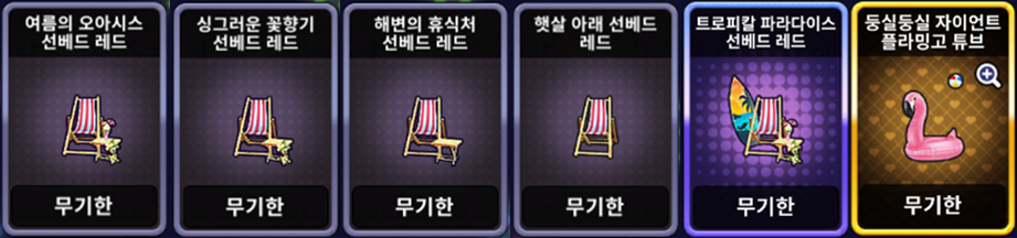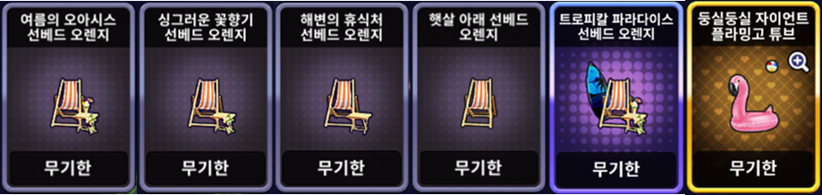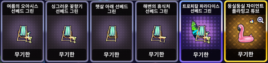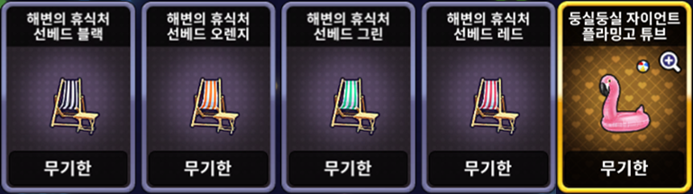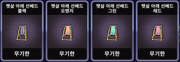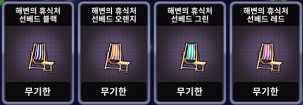 | [한정 이벤트] 해변의 휴식처 선베드 세트 | ![]() | 10,000 EXP 1개 |