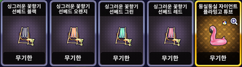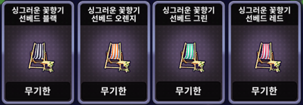 | [한정 이벤트] 싱그러운 꽃향기 선베드 세트 | ![]() | 10,000 EXP 1개 |