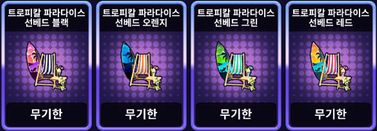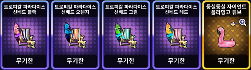 | [한정 이벤트] 트로피칼 파라다이스 선베드 세트 | ![]() | 10,000 EXP 1개 |