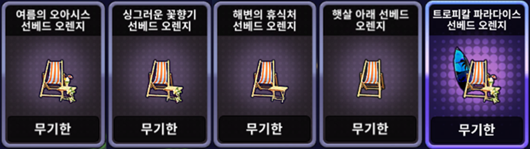 | [한정 이벤트] 낭만있는 여름 휴가 오렌지 세트 | ![]() | 1,000 EXP 12개 |