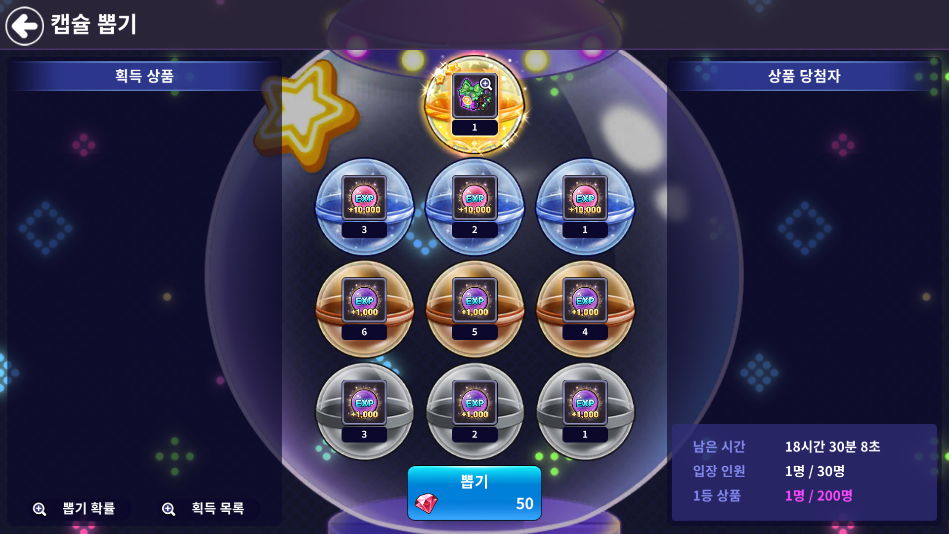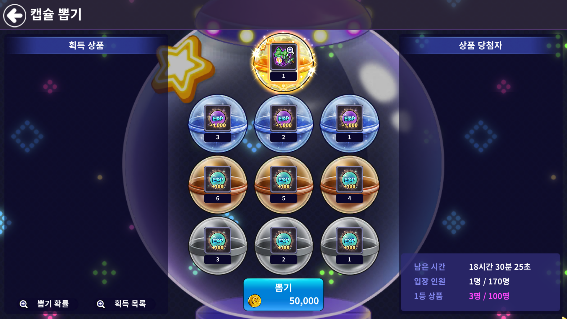 - 골드 캡슐 뽑기: 50,000 골드