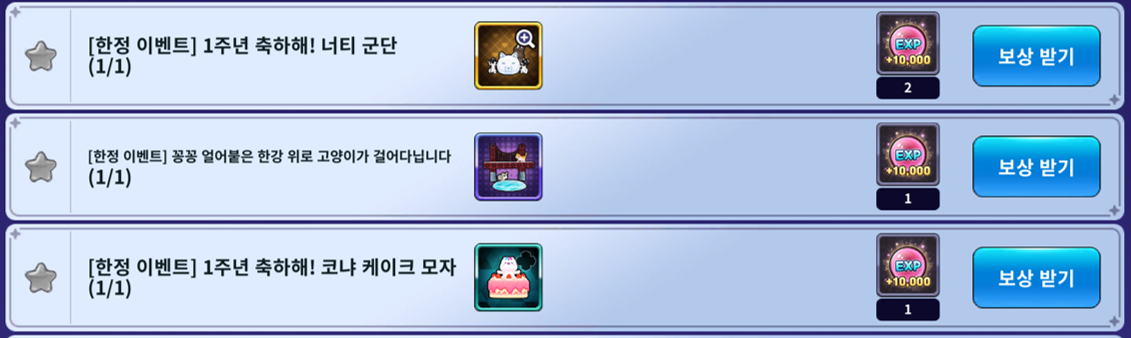 - 1주년 축하해! 너티 군단 (보상: 10,000 EXP 2개)