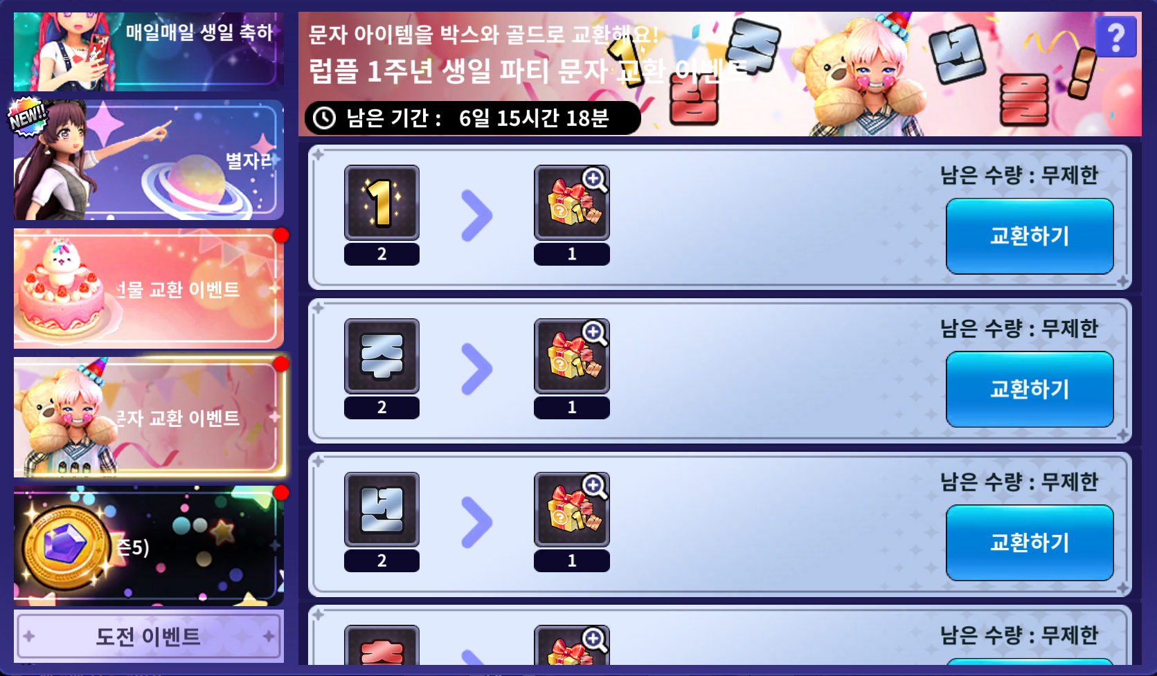 - 획득한 문자 아이템은 1주년 기념 이벤트가 진행되는 기간에만 교환할 수 있으며,