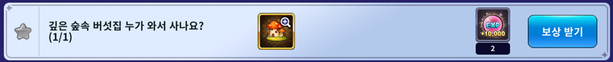- 깊은 숲속 버섯집 누가 와서 사나요? (보상: 10,000 EXP 2개)