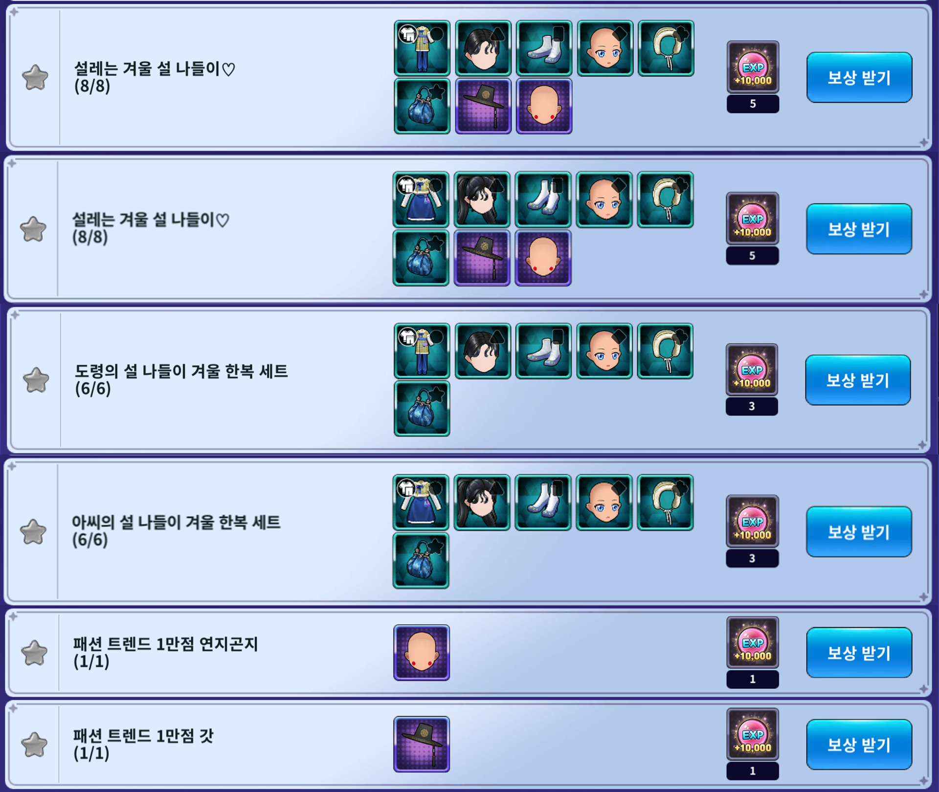 - 도령의 설 나들이 겨울 한복 세트 (보상: 10,000 EXP 3개)