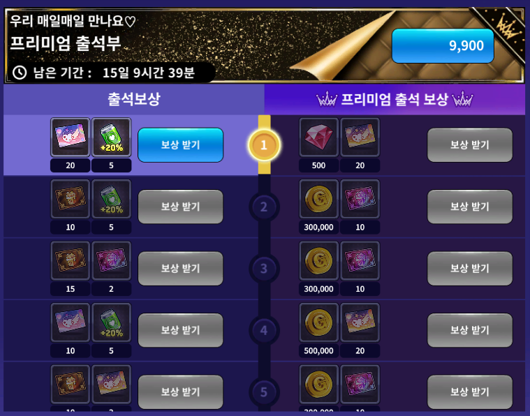 | 일반 출석 보상 | 프리미엄 출석 보상 (9,900원) | ||