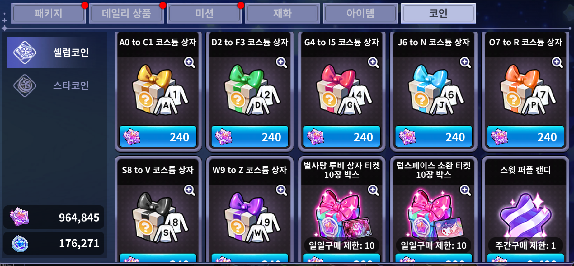 | A0 to C1 코스튬 상자 1개 | 셀럽코인 240개(무제한) |