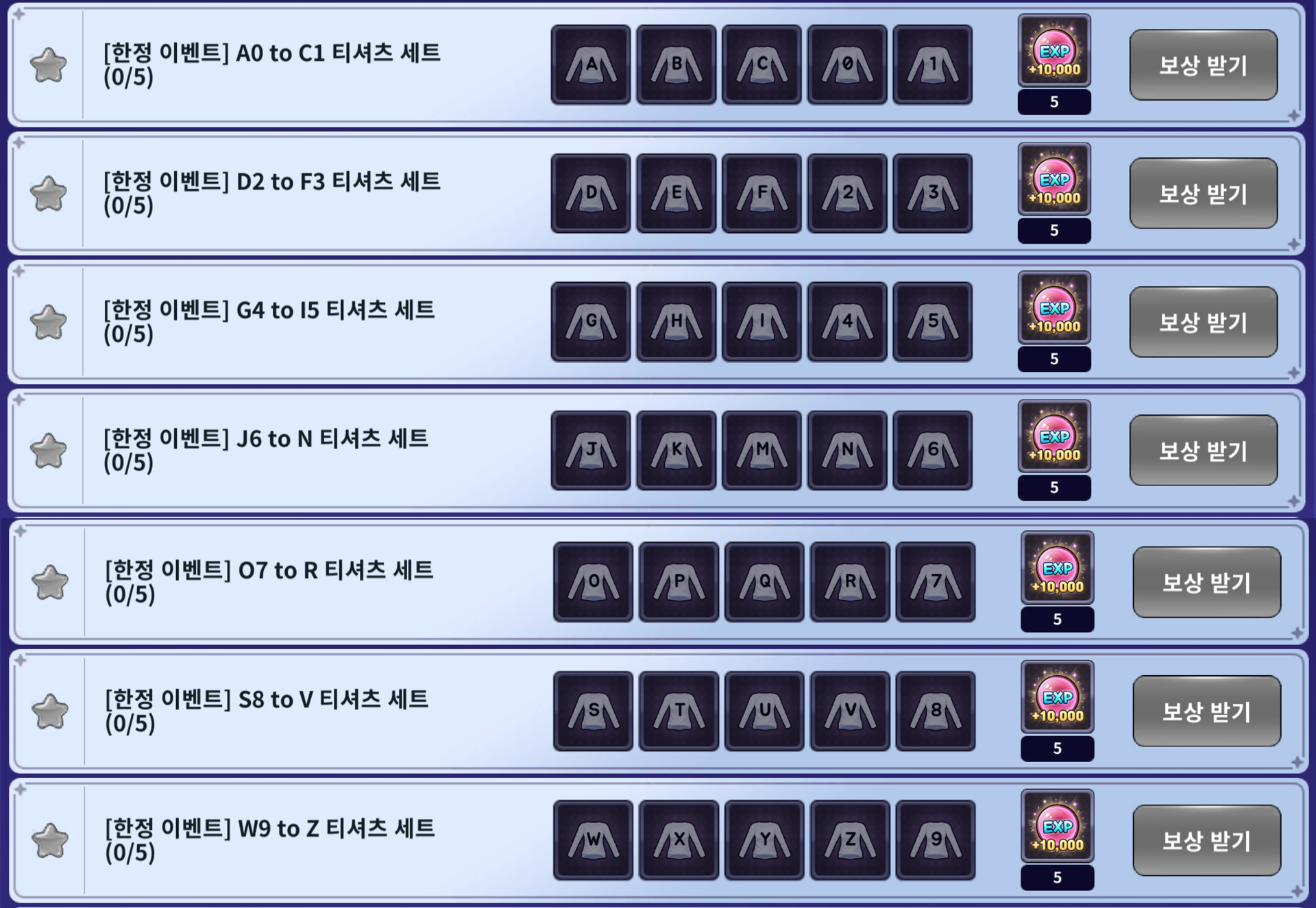 - A0 to C1 티셔츠 세트 (보상: 10,000 EXP 5개)