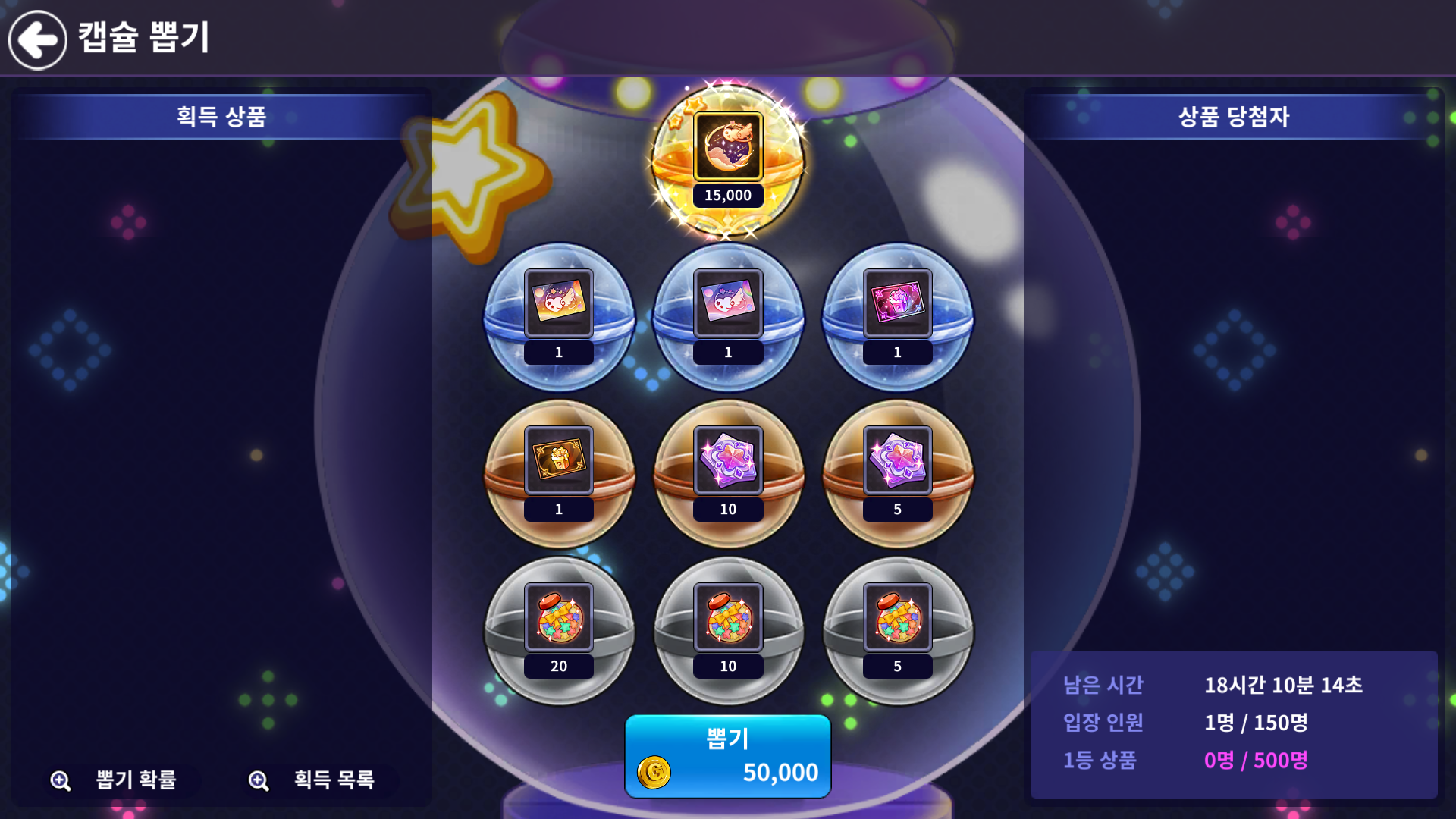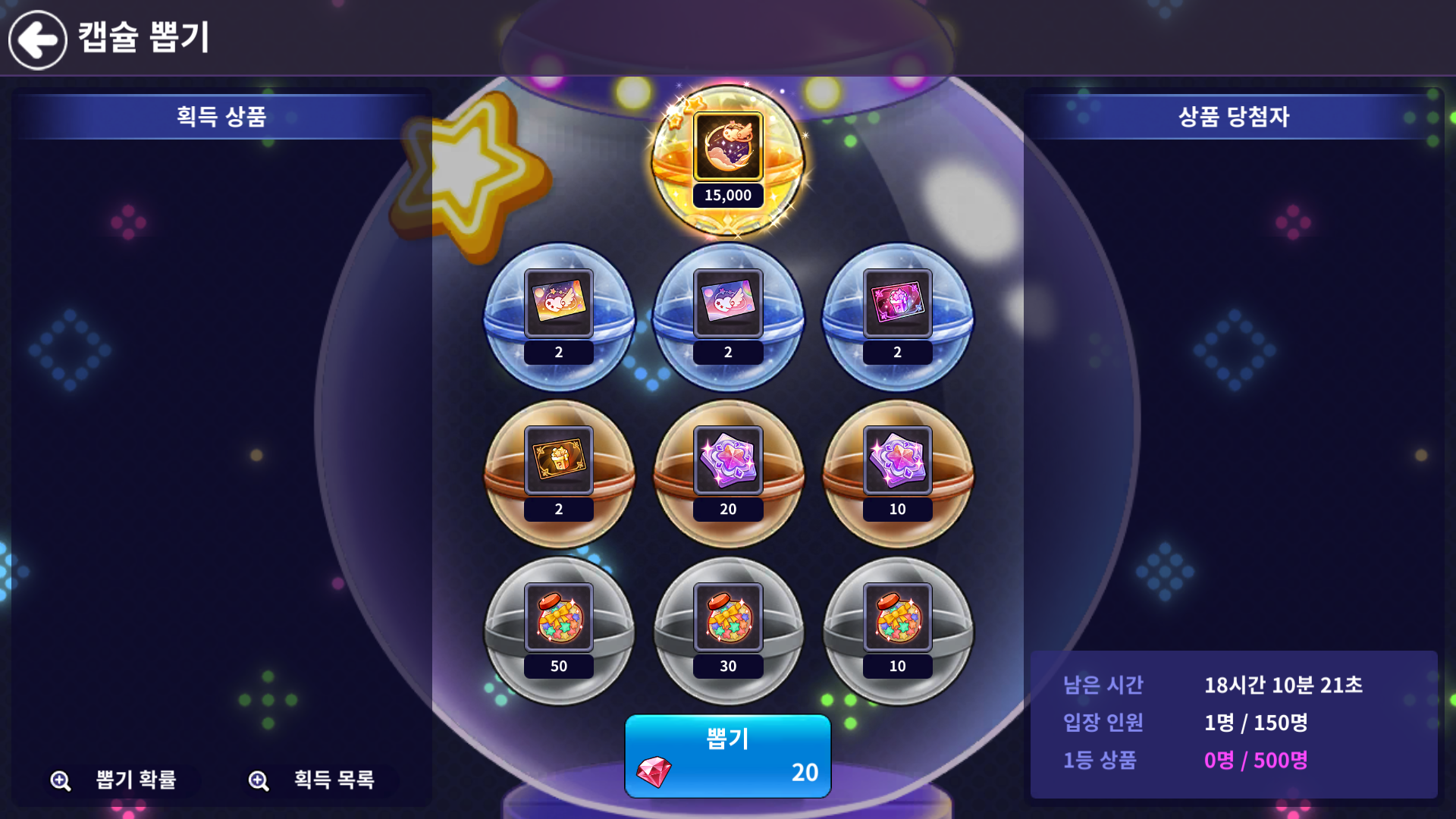 - 입장 후 뽑기 코인을 지불하여 캡슐을 뽑을 수 있습니다. - 1등 상품에 한정된 개수가 모두 소진되거나, 진행 시간이 마감될 경우 해당 캡슐 뽑기가 종료됩니다.