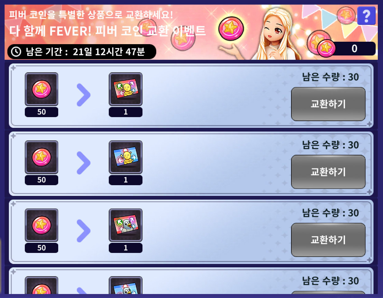 - 획득한 피버 코인을 원하는 성장 재로 교환할 수 있습니다.