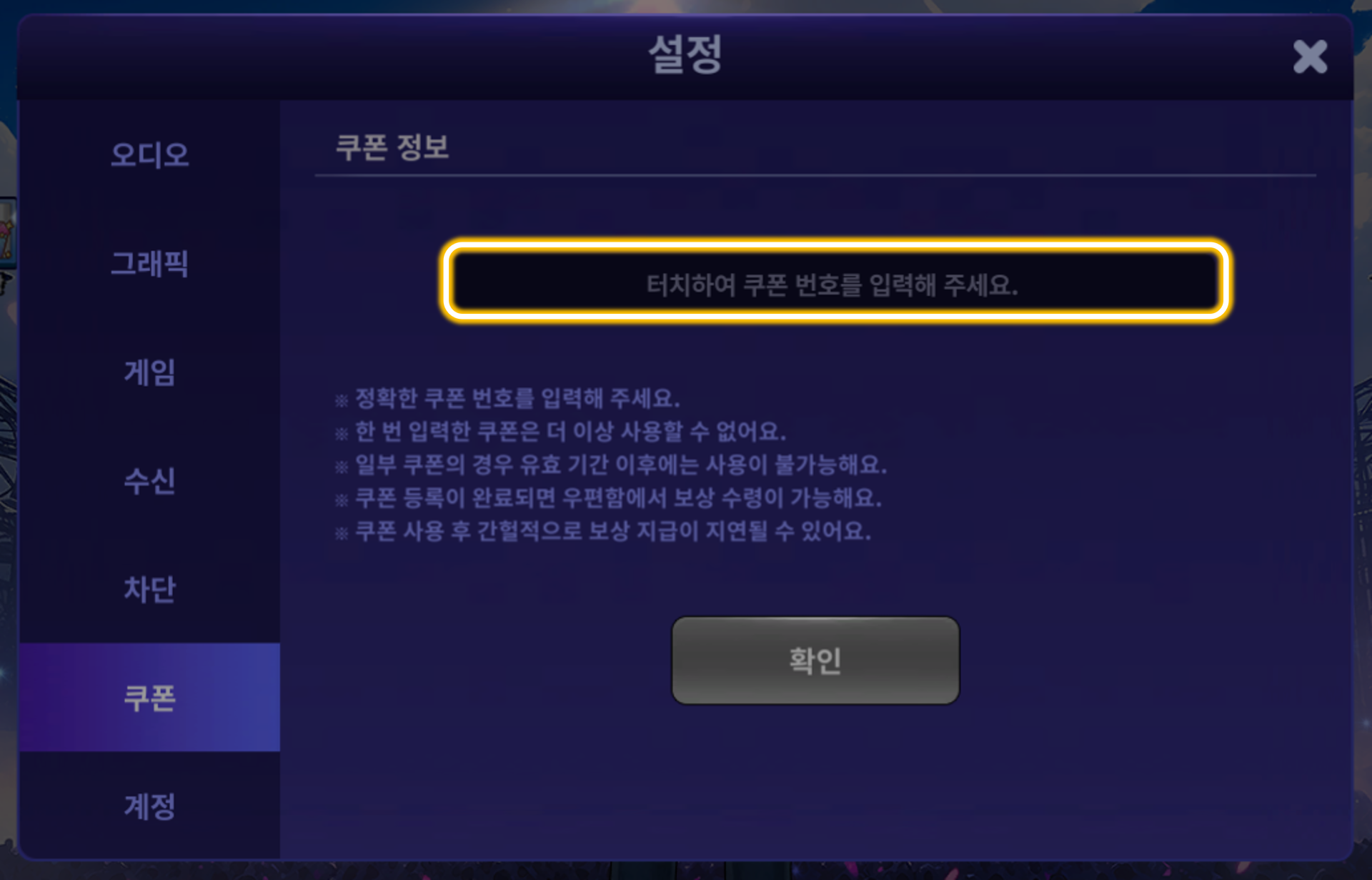 - 쿠폰  입력 시 보상이 [우편함]으로 지급됩니다.